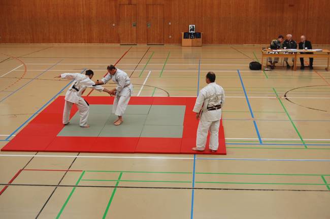 KATA: Bei den einzelnen Prüfungsteilen zeigte der Laufer sehr gute Leistungen. Seine Kürkata (Form) TOMARI BASSAI (Shito-Ryu) und BASSAI SHO (Shotokan-Stil) bewertete Prüfer Marcus Gutzmer als Beste der angetretenen Prüflinge. (Passai, Patsai) ist der Name einer der wichtigsten Karate-Kata. Sie gilt im Karate außerdem als eine der ältesten Kata. Bassai heißt übersetzt "die Mauer zerstören" oder "Erstürme die Festung". Dementsprechend kraftvoll soll auch die Kata vorgeführt werden. Sie lässt sich auf die okinawanischen Tōde-Katas zurückführen. Man geht davon aus, dass sie in ihrer Urform bereits im späten 13. Jahrhundert durch chinesische Meister gelehrt wurde und in Folge der Handelsbeziehungen nach Okinawa kam. Es existieren heute viele Variationen dieser Kata in verschiedenen Shorin-Karate Schulen: ITOSU, MATSUMURA, OYADOMARI, TOMARI, ISHIMINE, usw. Meister Oyadomari wird zumeißt als Entwickler der Urform genannt. Während Bassai Sho mehr defensiv agiert, handelt Tomari Bassai mehr offensiv. Privat- und Trainingsstunden bei den ausgewiesenen Kataspezialisten Bundestrainer Kata Karamitsos (Frankfurt), Diplom und Landestrainer Kata (SAH & RH-PF) Marcus Gutzmer (Kaiserslautern) und Fritz Nöpel (Kamen) polierten die Kata-Kenntnisse des Laufers J. Mayer bis zuletzt.