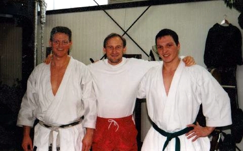 Fotos oben und unten: mit Gastgeber Karate Großmeister Hans Peter Wiegert, jetzt 8.Dan, unten links, ca. 1998 in Lauf bei einem Special Training mit Jürgen Mayer, unten Mitte, für TONFA
