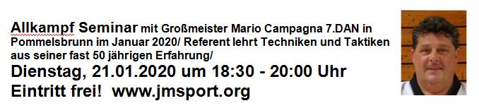 Am Dienstag, den 21. Januar 2020 fand in Pommelsbrunn wieder ein Kampfkunst Highlight statt. Gleich zu Anfang des neuen Jahres hatten die Karateka der heimischen Karate Schule Mayer e.V. Gelegenheit bei einem Großmeister mit fast 50 Jahren Erfahrung die Kampfkunst zu erlernen. Nachdem die Veranstaltung bereits 2018 mit Mario Campagna 8.DAN (Schwanstetten) stattfinden sollte und wegen seiner schweren Krankheit abgesagt werden musste, klappte es jetzt den mittlerweile 70 jährigen nach Pommelsbrunn zu locken. Nur 14 Teilnehmer, darunter langjährige Schwarzgurträger des KSM e.V., u. a. Elke Beck 3.Dan und Vizeweltmeister Christian Wild 2.Dan (siehe unten Video der DAN-Prüfungen im Dezember 2018), wussten den Wert dieser außergewöhnlichen Veranstaltung der eigenen Karate Schule zu schätzen! Toll, dass doch einige wenige Kinder teilnahmen. Dies geht natürlich nur mit der Unterstützung und dem Verständnis ihrer Eltern.