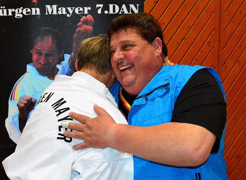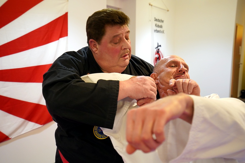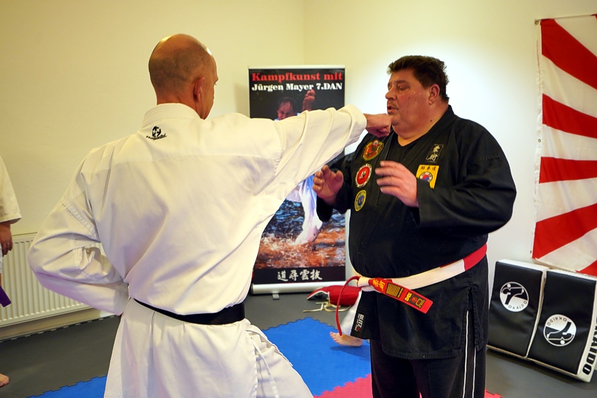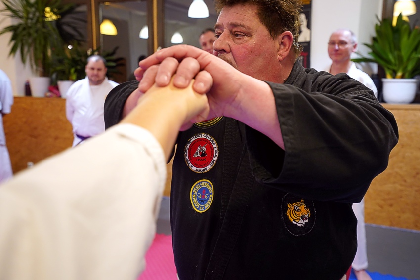 Mario zeigte sich äußert "griffsicher" in der Selbstverteidigung! Jedwede Attacke wurde mit Block, Meidbewegungen und Schlägen sofort gekontert und dann anschließend mit allen möglichen Varianten von Hebeln "Ju-Jitsu-like" traumhaft sicher abgeschlossen. Es war eine Lehrstunde in Katame-Waza (Grifftechniken)! Er zeigte "zupackend" Osae-Komi-Waza, (Haltetechniken), Shime-Waza (Würgetechniken) und Kansetsu-Waza (Hebeltechniken). Man hatte keine Chance seinem schmerzhaften Schraubstockgriff zu entkommen.Bei Streckhebeln wird das Gelenk überstreckt, wie beispielsweise beim Ude-Hishigi bzw. Kannuki-Gatame (Armstreckhebel). Bei Beugehebeln Garami wird das Gelenk maximal gebeugt, u.a. wie beim Kote-Mawashi-Irimi (Handdrehbeugehebel). Mario zeigte auch Drehhebel. Dabei wird das Gelenk verdreht, zum Beispiel beim Kote-Gaeshi (Kipphandhebel). Diese verschiedenen Hebel finden in der Selbstverteidigung Anwendung. Aber auch in den Karate Kata sind diese Hebel für den Laien unsichtbar zu finden. Die Vertiefung der grundlegenden Hebeltechniken war sowohl für Anfänger als auch für Fortgeschrittene eine wertvolle Erfahrung. Nach fast zwei Stunden intensiven Trainings wurde der Kurz-Lehrgang beendet und man ging zum gemeinsamen Essen nach Eschenbach in den GRÜNEN SCHWAN. Wirt und Koch Bernd Portune (siehe Foto unten) hat ja auch schon als Kind bei Jürgen Mayer 7.DAN Karate trainiert.