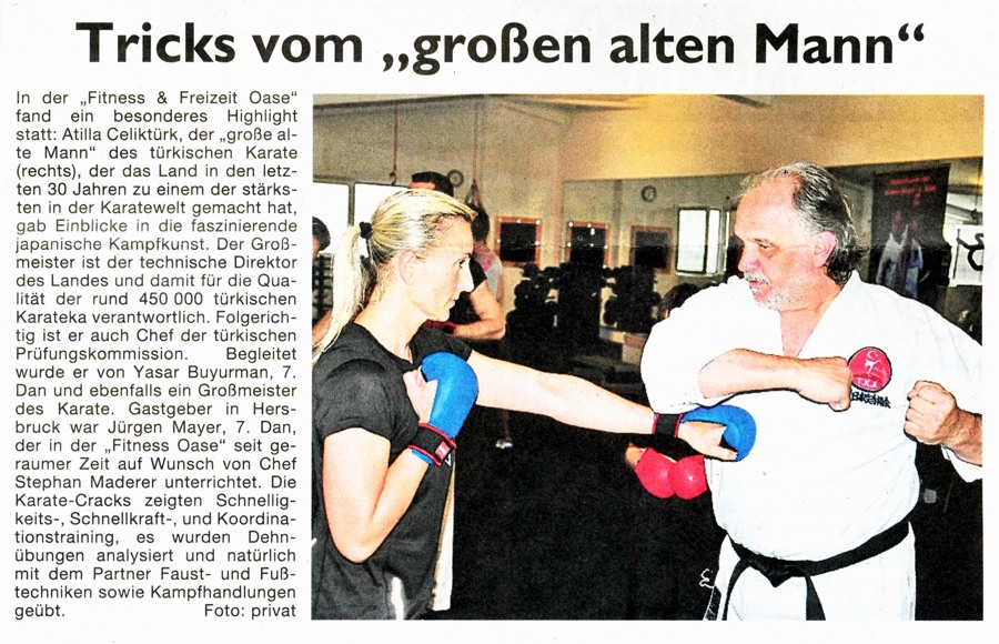 Hersbruck, im Mai 2014: In der Fitness & Freizeit Oase, Houbirgstr. 11, fand ein besonderes Highlight statt. Der "große alte Mann" des türkischen Karate, der diese Nation in den letzten 30 Jahren zu einer der Stärksten in der Karatewelt geführt hat (LINK Ergebnisse der aktuellen EM in Finnland), gab kleine Einblicke in die faszinierende japanische Kampfkunst! Der Großmeister ist der technische Direktor des Landes und damit für die Qualität der rund 450.000 türkischen Karateka verantwortlich! Folgerichtig ist er auch Chef der türkischen Prüfungskommission! Begleitet wurde er von Yasar Buyurman, der mit dem 7.Meistergrad graduiert, auch ein Großmeister des Karate ist. Gastgeber in Hersbruck war Jürgen Mayer, 7.Dan, der in der Fitness OASE www.fitness-hersbruck.de seit geraumer Zeit auf Wunsch von Chef Stephan Maderer unterrichtet.