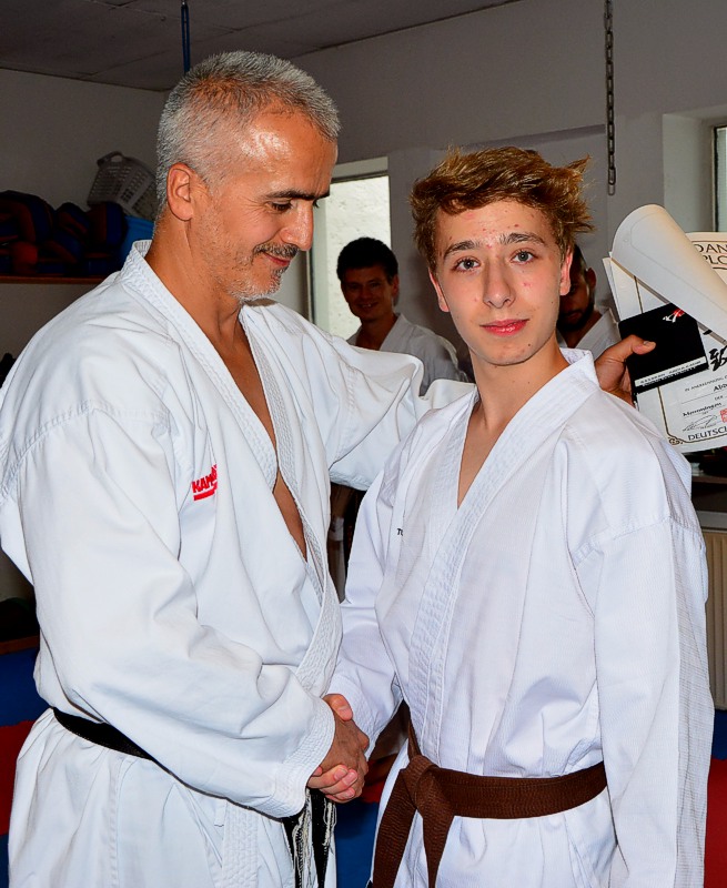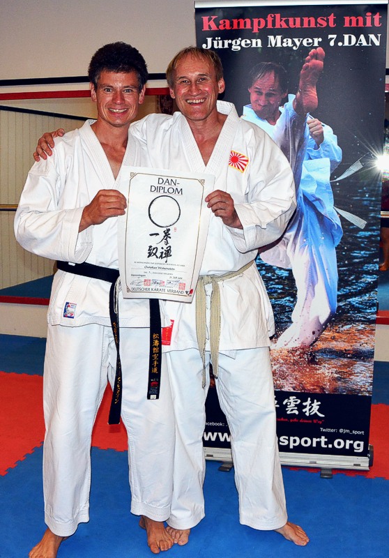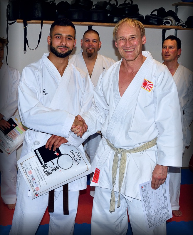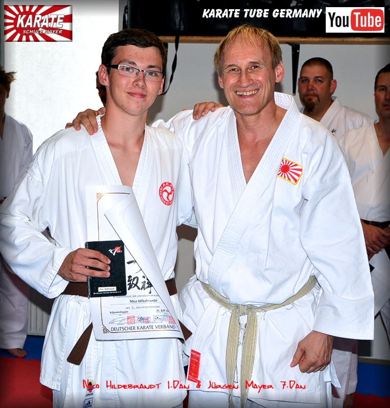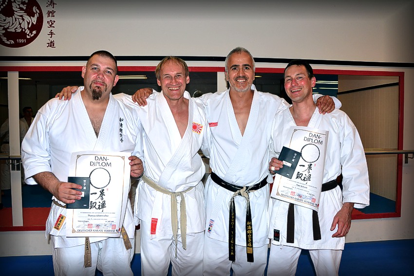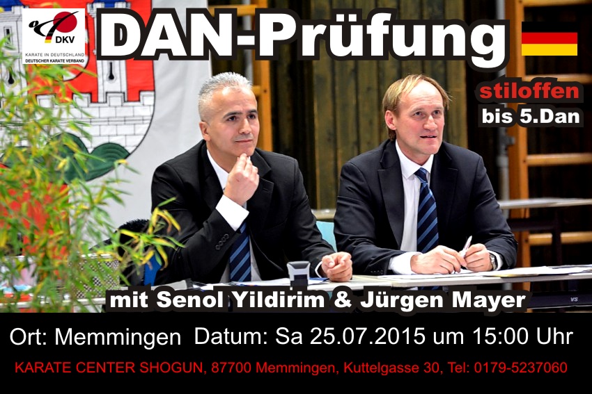 Memmingen/ Am 25.07.2015 fanden im hochsommerlichen Schwaben (Süddeutschland) im perfekt eingerichteten KARATE CENTER SHOGUN von Sensei Senol Yildirim Schwarzgurtprüfungen statt. Das bewährte Prüfergespann des Deutschen Karate Verbandes, Gastgeber Senol Yildirim und Jürgen Mayer, graduierte am Samstagabend nach zwei Einheiten Vorbereitungstraining, die Karatekämpfer zum Meistergrad. Bereits im Training vorher wurde den Prüflingen eingehend auf den Zahn gefühlt und ihnen letzte Tipps und Ratschläge von Weltmeister Senol und Ex-Landestrainer Jürgen gegeben! Die zu graduierenden Karateka aus drei Bundesländern (Baden-Württemberg, Sachsen-Anhalt und Bayern), und sechs verschiedenen Dojos zeigten gute bis hervorragende Leistungen in KIHON und KATA (Tekki, Bassai-Dai, Jion, Kanku-Dai, Chinte, Sochin, Nijushiho) und in ihrem selbstgewähltem Prüfungswahlteil. So sah man auch eine durchdachte, realistische Selbstverteidigung. Vielfältige Hebel und Würfe sind für diese neuen Karatemeister kein Problem. Aber auch traditionelles, wie modernes, funktionierendes WKF-Kumite und abschließende Freikämpfe. So konnten dann, nach dreieinhalb Stunden Prüfungsstreß, 8 der 9 angemeldeten Karateka, erfolgreich den 1. bis 3. Dan (Meistergrad) erreichen. Unter ihnen auch zwei Schüler der Karate Schule Mayer e.V., Andre Ernstberger und Robert Hein. Ein herzlicher Glückwunsch zum bestandenen Dangrad im Karate an alle neugraduierten Kämpfer!