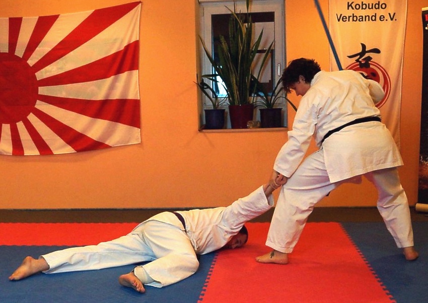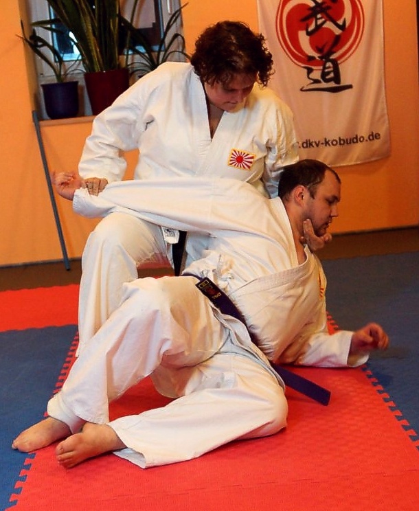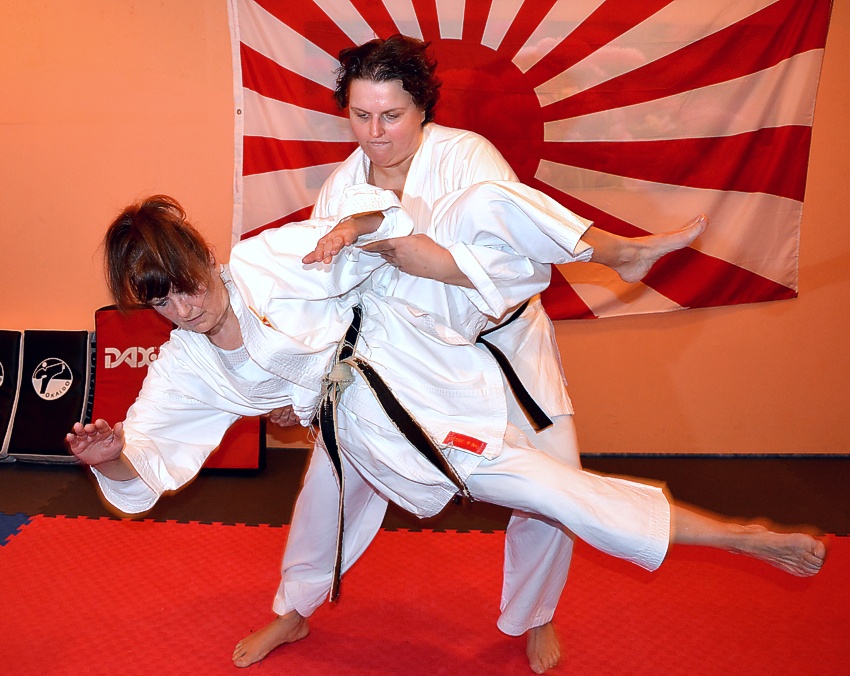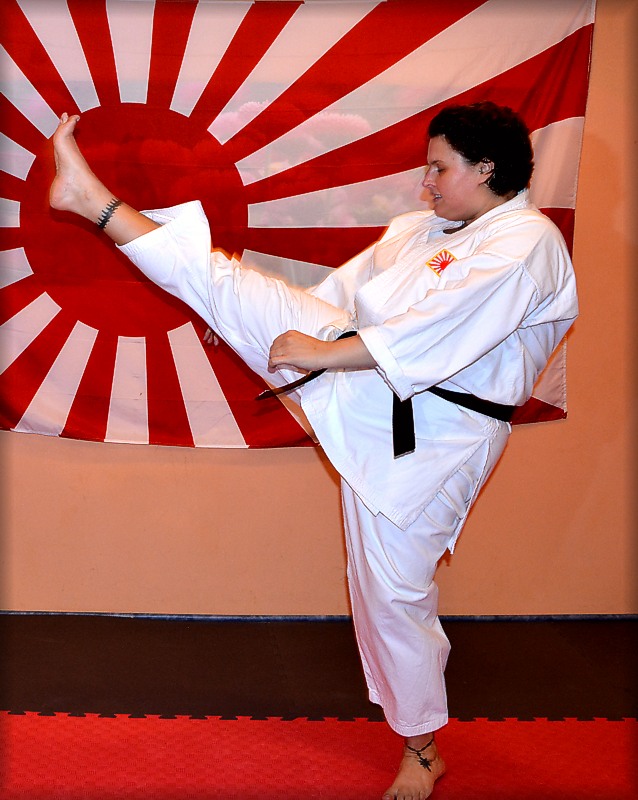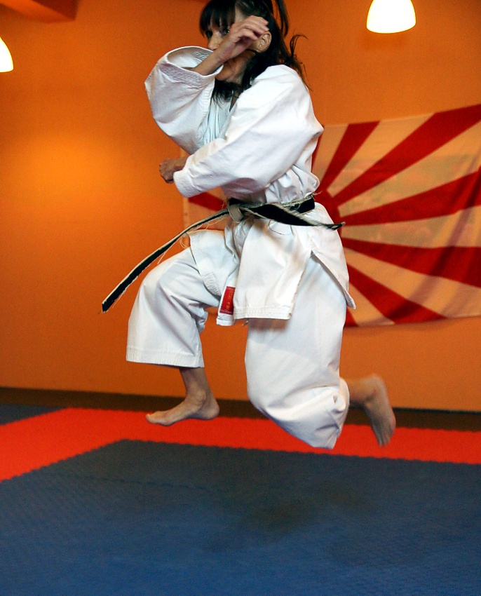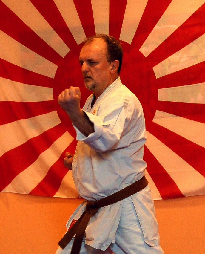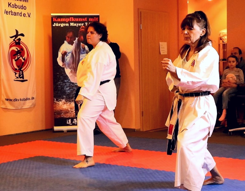 Karateschlägen und -tritten ausgestattet, erreichte nun den 2. Dan nach 25