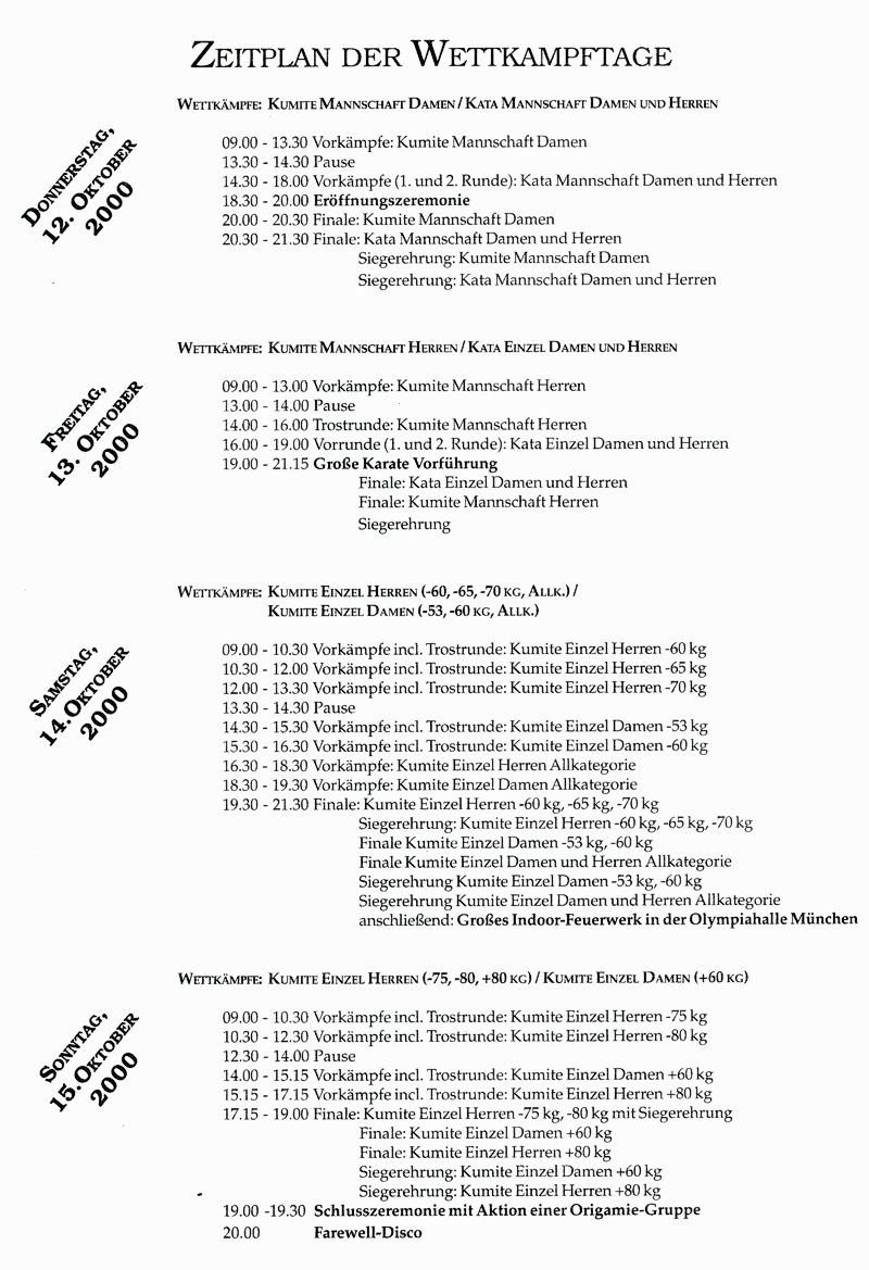 Eingebaut in den reinen Kumite- (Freikampf)tages waren exzellente Karate-Demonstrationen von Kata- (Formen) Bundestrainer  Karamitsos, die Kemptener „Lederhosen-Karateshow", sowie eine Budo- Vorführung durch Wolf-Dieter Wichmann (6. Dan). Der Knochenmarkspenderverein Carmen Maria e.V. verloste eine Flugreise nach Japan. Bei den Finalkämpfen am Abend wurden die Highlights zusätzlich kommentiert und auf einen Videowürfel in der Kuppel der Halle übertragen, hier in Slow-motion wiederholt und mit Archivaufnahmen und Interviews vervollständigt. Den Abschluß des Samstages bildete ein einzigartiges Indoor-Feuerwerk.