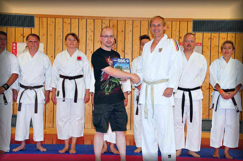Fotos oben und unten: Jürgen Mayer, Präsident des Deutschen Kobudo Verbandes überreichte ein Buchgeschenk. Bereits beim Gründer des KD Eschenbach, dem Ägypter Maher, einem Shito-Ryu Stilisten, hielt J. Mayer Training!