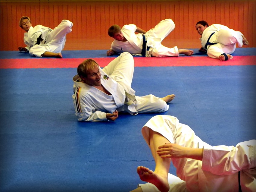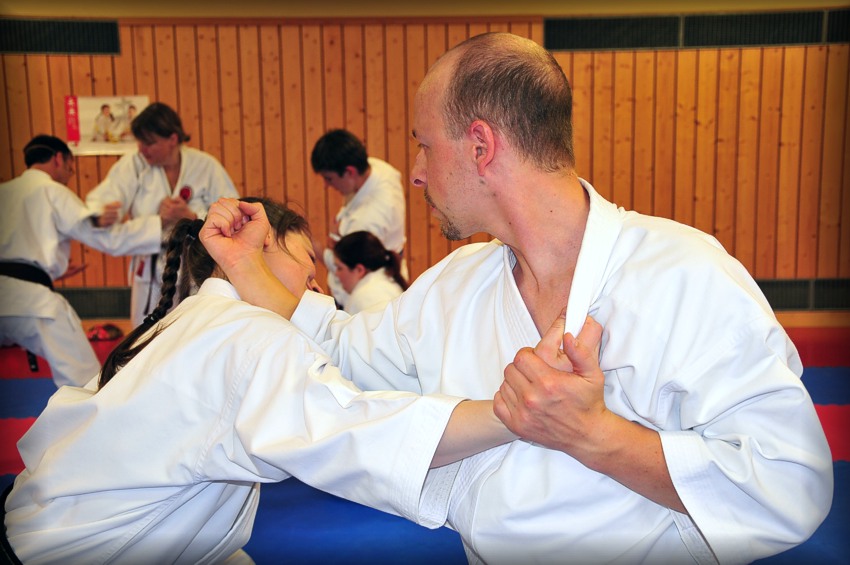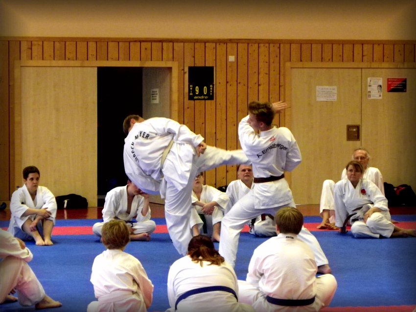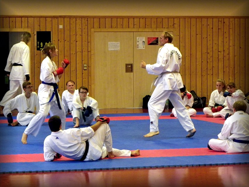 Foto oben: Jürgen Mayer, 7.Dan, Ex-Landestrainer für Kumite, lehrte Grundlagen, Schnellkraft, Technik und Taktik des Kampfes.
