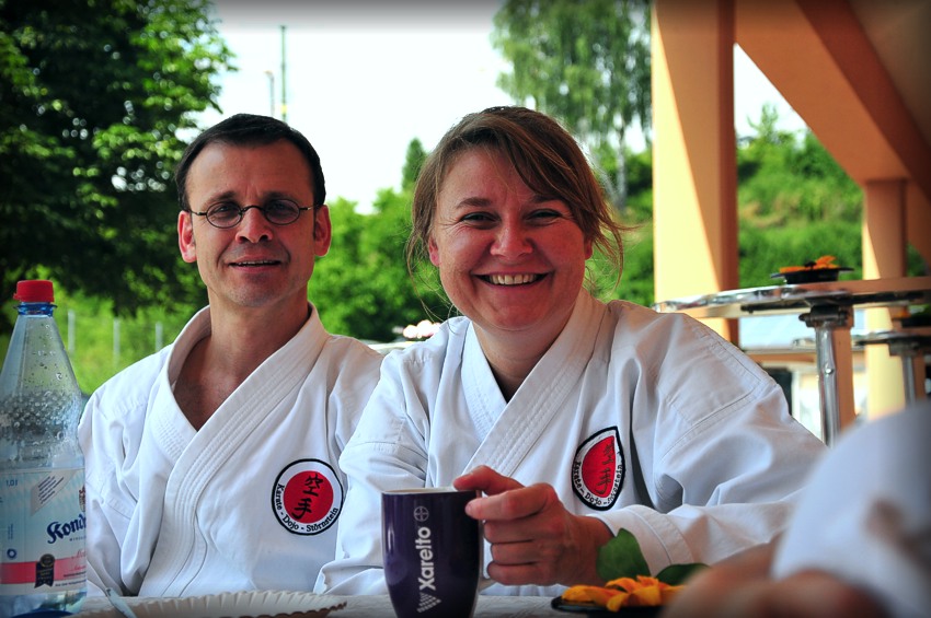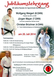 Eschenbach, Sonntag, den 20.07.2014: Rund 45 Teilnehmer, Kinder, Jugendliche und Erwachsene aus fünf bayerischen Vereinen trainierten bei hochsommerlichen Temperaturen zusammen in Eschenbach. Die Karateka absolvierten drei intensive Trainingseinheiten in der 4.000-Einwohner Stadt in chronologischer Reihenfolge unter Leitung von Jürgen Mayer, 7.Dan, Gastgeber und Jubilar Christian Brüchner, 4.Dan und dem DKV Präsidenten Wolfgang Weigert, 6.Dan. Den ganzen Sonntag fand Training statt und man hatte gute Gespräche. Der Veranstalter Karate-Dojo Eschenbach um Christian & Barbara Brüchner hatte beste Rahmenbedingungen auf dem SCE-Vereinsgelände bei hochsommerlichen Temperaturen geschaffen! Die Stimmung und der Anspruch ein sportlich hohes Niveau anzubieten waren ausgezeichnet und mit dem Trainerteam gegeben! Ein hervorragendes, reichhaltiges Kuchenbuffet stellten die Damen des Vereins unter Leitung von Karate-Abteilungsleiter Herrn Brüchner senior auf die Beine. Neben dem reichhaltigen Kuchen-, Wurstsemmeln- u. Süßigkeitenbuffet, boten sie auch warme Snacks und Obst an. Als Ausklang des schönen Sommertages gingen Trainer und Dojomitglieder noch zum hervorragenden Italiener "NOWAS" nach Pressath.