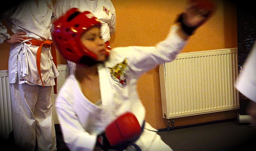 bis jetzt erlerntes Technik-Repertoire, Faust- und Fußtritte. Der junge