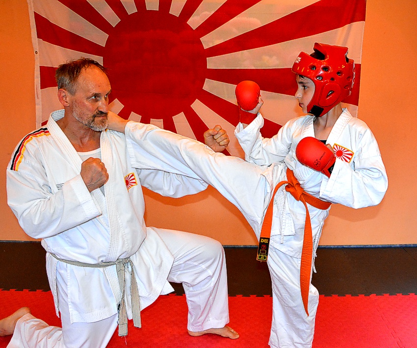 Felix, mit der Technik Mawashi-Geri, und sein Partner Martin absolvierten die besten Kinder-Prüfungen, dynamisch & präzise