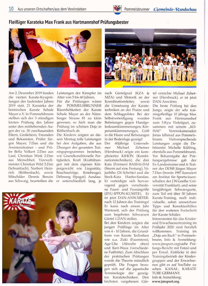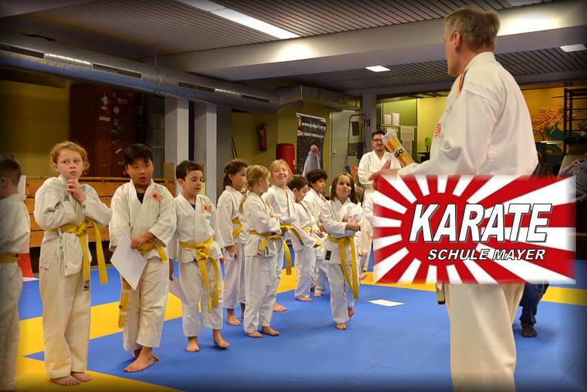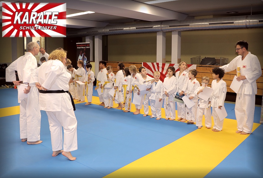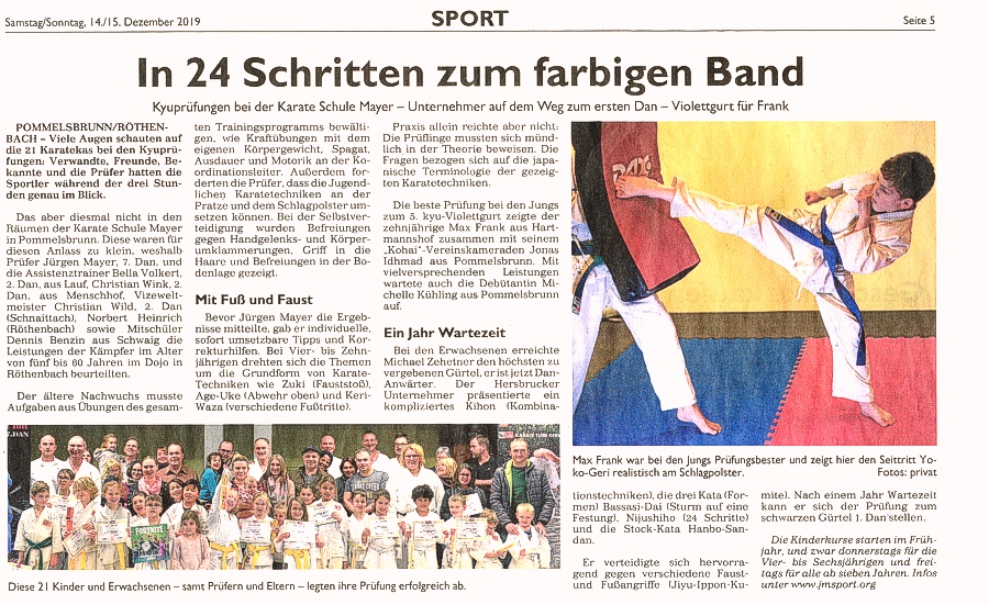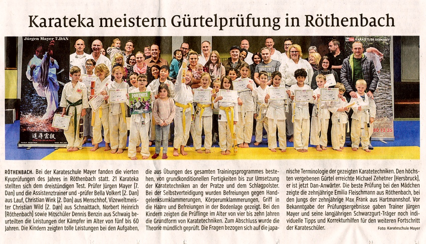 Am 2. Dezember 2019 fanden in Röthenbach die vierten Karate-Kyuprüfungen des laufenden Jahres 2019 statt. 21 Karateka der heimischen Karate Schule Mayer e.V. stellten sich der 3 stündigen letzten Prüfung des Jahres unter den mitfiebernden Augen der ca. 30 zuschauenden Eltern, Großeltern, Freunden und Bekannten. Prüfer Jürgen Mayer, 7.Dan und die Assistenztrainer - und Prüfer Bella Volkert 2.Dan aus Lauf, Christian Wink 2.Dan aus Menschhof, Vizeweltmeister Christian Wild 2.Dan, Norbert Heinrich (Röthenbach), sowie Mitschüler Denis Benzin aus Schwaig, beurteilten die Leistungen der Kämpfer im Alter von 5 bis 60 Jahren.