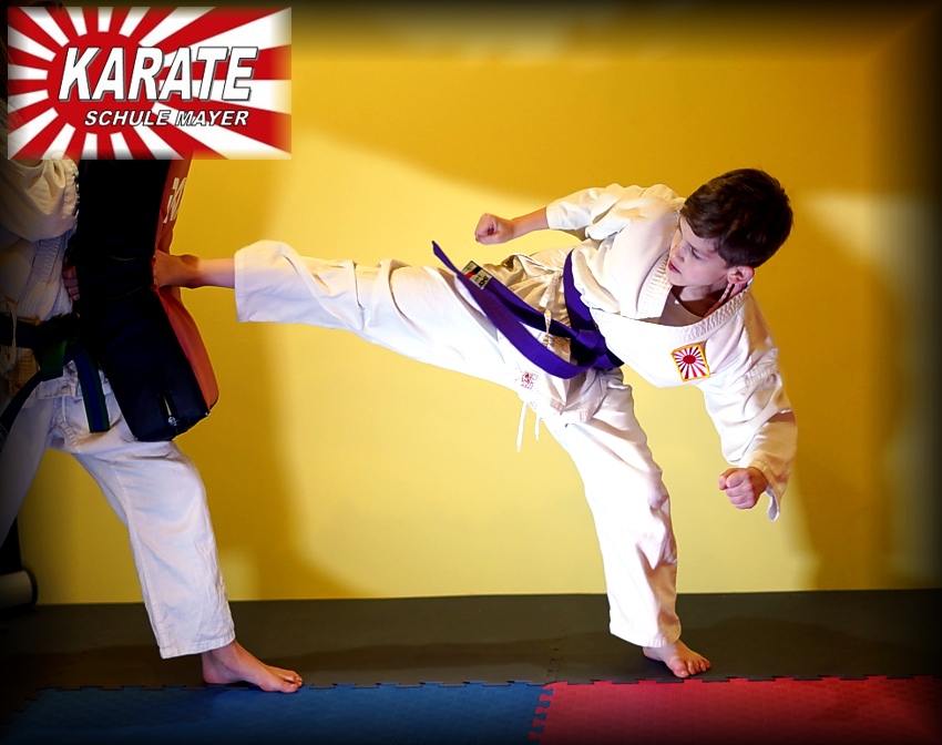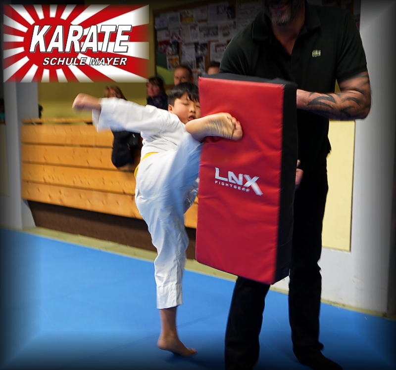 Foto oben: Max zeigt YOKO-GERI, gestoßener Tritt zur Seite, und bringt schon ganz schön Druck auf das Schlagpolster