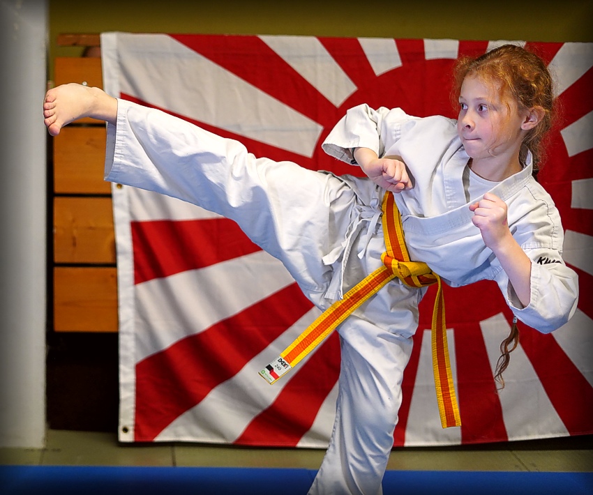 Foto oben: Prüfungsbeste bei den Mädchen Emilia Fleischmann 8+. Kyu, mit einem (fast) perfekten YOKO-GERI - Seittritt