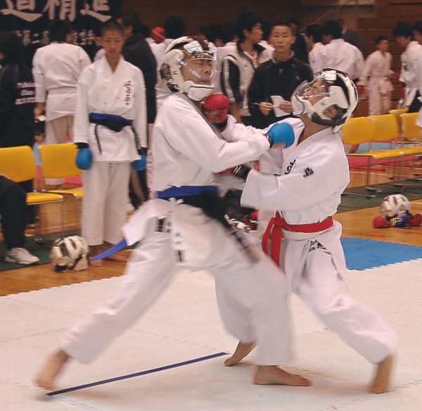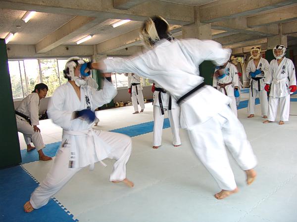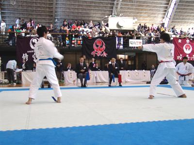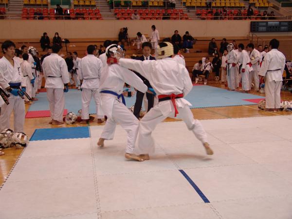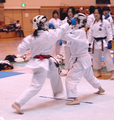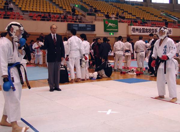 Fotos oben: bei den Highschool Meisterschaften (WKF-Regeln) ist nur ein Treffer ein Punkt. Verwarnungen gibt es fasst keine, auch bei sehr harten Treffern nicht! Übrigens ist es dem Einspruch der Europäer zu verdanken, dass der so erfolgreich in Japan verwendete Kopfschutz (keine blutigen Verletzungen/ richtiges Distanzverhalten) nicht international eingesetzt wird.