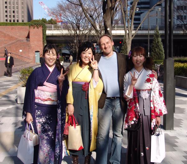 Graduates from School wearing traditional Kimono in West-Shinjuku (Tokyo) with