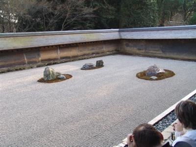 Fotos oben: Ryōan-ji (jap: 龍安寺, „Tempel des zur Ruhe gekommenen Drachen“) ist ein 1499 gegründeter Zen-Tempel im Nordwesten von Kyōto. Erbaut wurde er 1450 von Hosokawa Katsumoto. Er ist eine touristische Hauptattraktion und Teil der „Historischen Denkmäler des alten Kyoto“, seit 1994 ein UNESCO-Weltkuturerbe. Der Tempel gehört zur größten Schule des Rinzai-Zen mit dem Muttertempel Myōshin-ji. Hauptattraktion des Tempels ist der hier befindliche und wohl berühmteste Zen-Garten Japans, der Hojo-Teien im Kare-san-sui-Stil aus der Mitte des 15. Jahrhunderts. Der Garten besteht aus einer Fläche (30 mal 10 Meter) aus fein gerechtem Kies mit 15 scheinbar zufällig platzierten Steinen in 5 bemoosten Gruppen. Aus keinem Blickwinkel sind alle 15 Steine sichtbar. Die südliche und westliche Seite des Gartens ist von einer rötlichen Mauer gesäumt, über welcher der Blick auf die Bäume und Sträucher des begehbaren Gartens fällt. Auf der nördlichen Seite befindet sich das Tempelgebäude mit der Sitzterrasse, von der aus man den Steingarten überschaut.