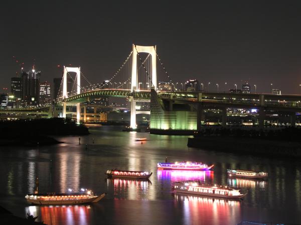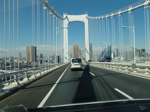 Tokio: Die Rainbow Bridge (jap. レインボーブリッジ, Reinbō Burijji) ist eine Hängebrücke über den Hafen von Tokio. Sie befindet sich im nördlichen Teil der Bucht von Tokio und verbindet den Shibaura-Kai mit Odaiba im Minato-Bezirk. Die Brücke wurde 1993 fertiggestellt, hat eine Länge von 570 m und befördert den Verkehr auf zwei Ebenen. Auf der oberen Ebene führt eine Schnellstraße über die Brücke (befuhr ich mit Hirota-Sensei), auf der unteren Ebene befindet sich die Yurikamome Bahnlinie, die ich nahm, um ins berühmte Onsen zu gelangen.