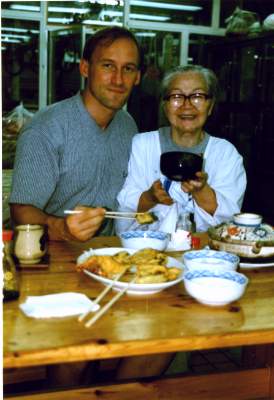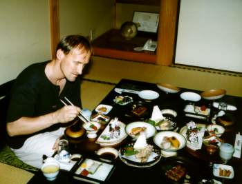 Trotz Bedenken mancher Deutscher in Bezug auf rohen Fisch und Tofugerichten, erwies sich die japanische Küche wieder als geschmacklich hervoragend, vielseitig und äußerst gesund. Lieblingsspeise wurden Sushi, ein gesäuerter kalter Reishappen belegt mit unterschiedlichstem rohen Fisch und Meeresfrüchten: Garnelen, Krebsen, Muscheln und Tintenfisch. Das Ganze wird eingetunkt ins Standartgewürz "O-Shoju" (Sojasauce). Auch "Tempura", Fisch und Gemüsestückelchen in Teig gehüllt und fritiert schmeckten Klasse, besonders wenn sie für Jürgen von Kikuchi (Bild links) in Naha zubereitet wurden.