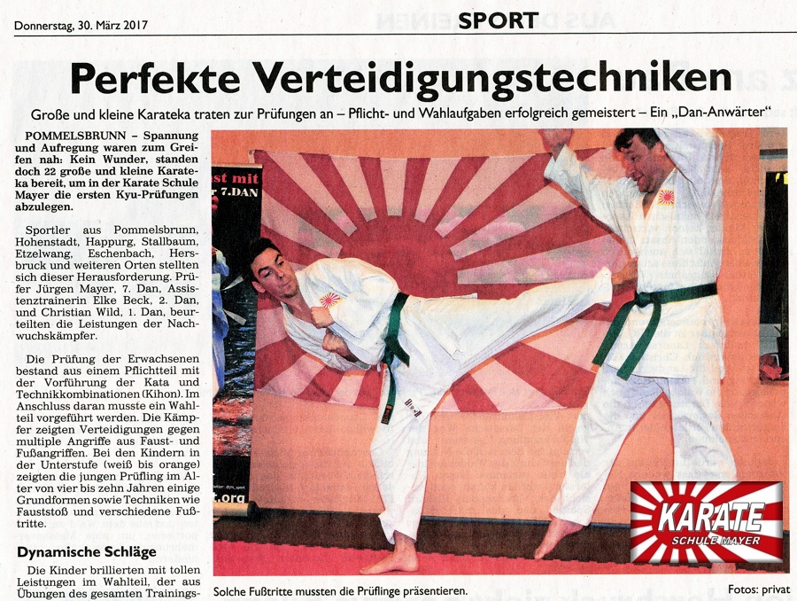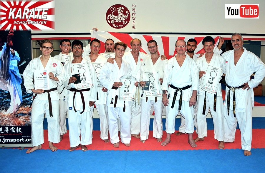 Karate-Schwarzgurte in Memmingen mit den Prüfern Jürgen Mayer 7.Dan (Mitte) und