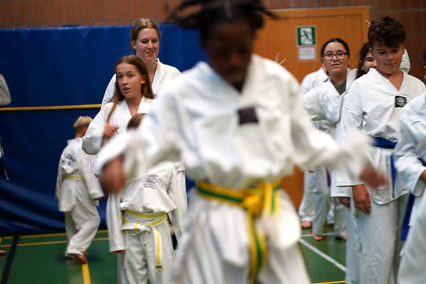 Kleinschwarzenlohe bei Wendelstein/ Dienstag 30. September 2025 Die anwesenden Taekwondoka folgten der Einladung ihres Vereinsleiters Holger Schmitt 7. DAN Taekwondo, zu einem Spezial-Training mit Karate Grossmeister Jürgen Mayer 7.DAN in der (Rangau-)Grundschulturnhalle. Holger und Jürgen absolvierten vor 30 Jahren gemeinsam im Dezember 1995 die Prüfung zum 1.DAN im Taekwondo in München. Seitdem besteht ein herzlicher und regelmäßiger Kontakt zwischen den beiden Kampfkunst- Grossmeistern. Rund 38 ambitionierte Kampfsportler, hauptsächlich Kinder und Jugendliche, nahmen an diesem aussergewöhnlichen Jubiläums-Event teil.
