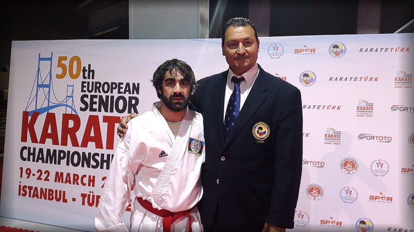 Foto oben: Sensei Ali Tarabeih 7.Dan (Israel) & EKF Kampfrichter, trifft Spitzenkämpfer Rəfael Ağayev, 5.Dan in Istanbul (2015)