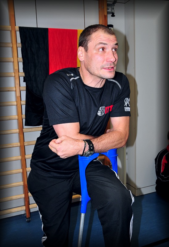 Trotz Knie-Operation hielt er Training. Der Boxtrainer des Karate-Center Shogun Memmingen, Heiko Dierich. Gute Besserung Heiko!