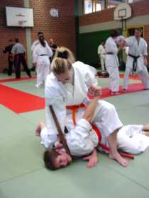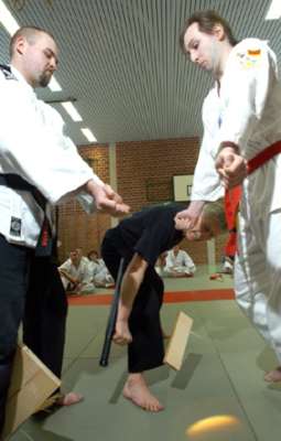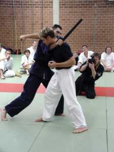 Dann ging`s zur Sache: Faust-, Fuß- und Griffattacken wurden mit Block, Schock, Stoß, Control, Take-Down, Festlege und Transporttechniken verhältnismäßig beantwortet. Verhältnismäßig heißt jedoch nicht unrealistisch. Handfest zur Sache gingen Berny Meyer, 2.Dan SV-Spezialist und Matthias Dülp, 5.Dan. Der Kampfkünstler Matthias Dülp gab eine Vorführung detaillierter Jime-Waza (Würgetechniken) bis zur berechneten Bewußtlosigkeit seines Vorführungs-Partners.
