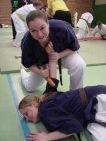 Degenhard K. , 2.Dan Ju-Jutsu aus Eisenach (Thüringen) und Max K. , Karateschwarzgurt und Polizeibeamter aus Traunreuth, stellten sich der Prüfung im TONFA-SV. Nachdem gute bis sehr gute Leistungen gezeigt wurden (Bild links Fallschule mit der Waffe, etc.), konnten nunmehr um 19.00 Uhr, die Prüflinge Ihre Kyu-Urkunden aus den Händen von J. Mayer, 4.Dan in Empfang nehmen. Damit war der Tonfa- Intensiv-Lehrgang erst um 19.00 Uhr nach den TONFA-SV-Prüfungen zuende. Dann ging es zur LG-Party ....