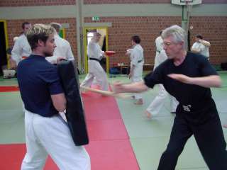 Vormittags standen zwei Trainingseinheiten, unterbrochen von einer kleinen Kaffeepause, bei excellenter Stimmung auf dem Programm: Bei den Handlingsübungen konnte Referent J. Mayer mit neuen Schwungkombinationen, die unter anderen auch beidhändig ausgeführt werden, auch so manch alten "Tonfa-SV`ler" überraschen. Handlingstechniken sind die Basis des Waffenkampfes. In einer richtigen SV-Situation muß man sich der Lage und Stellung seiner Waffe immer taktil bewußt sein. "FREESTYLE"-Handling forderte die Kreativtät der Einsatzstock-Liebhaber.