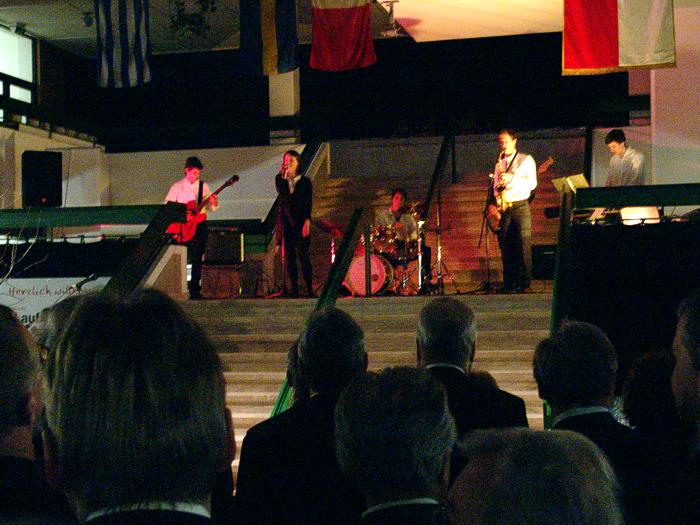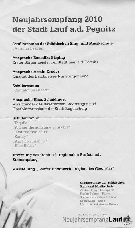 Nach musikalischen LIVE-Darbietungen der städtischen Schülercombo (sieh Foto unten) wie "Sunny" eröffnete der Laufer Bürgermeister den Stehempfang der Stadt Lauf. Die jedes Jahr übliche Kunstausstellung vom Laufer Künstlerkreis wurde vom neuen Bürgermeister abgeschafft. Viele bedauerten dies, wie Gerda Karina Hederer, da die Ausstellung das vielfältige, künstlerische Schaffen Laufer Künstler zeigte und immer optisch einen schönen Rahmen bot. |