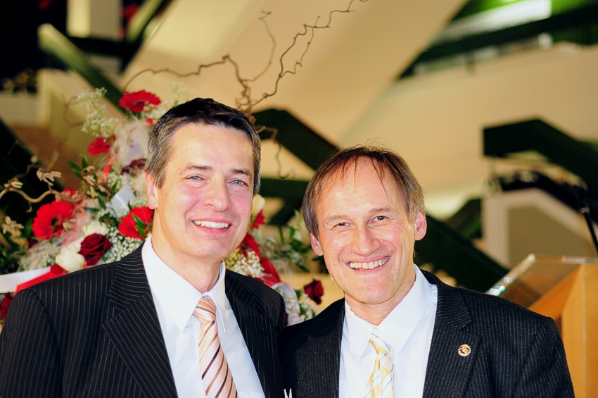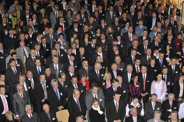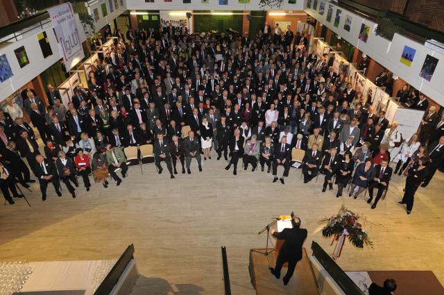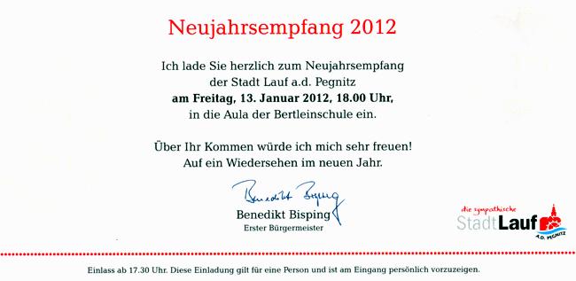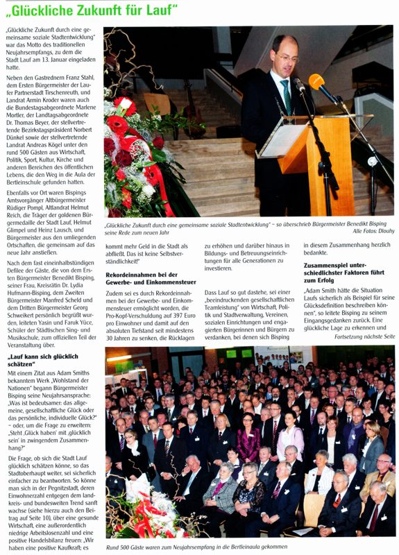 Neujahresempfang seiner Heimat- und Geburtsstadt! Lauf/ Aula der Bertleinschule: wieder rund 600 Teilnehmer, verschiedenster Couleur aus Politik, Wirtschaft, Soziales, Kirche, Sport und Kultur trafen sich zum traditionellen Meinungsaustausch am Freitag, den 13.01.2012 in der Aula der Laufer Bertleinschule beim traditionellen Neujahresempfang der Stadt Lauf an der Pegnitz. So dauerte das Defilee, das "feierliche Vorbeschreiten", am Bürgermeister, seiner Ehefrau, dem 2.Bürgermeister Manfred Scheld (FWG - wie immer sehr herzlich) und dem 3.Bürgermeister Schweikert (SPD), der zahlreichen Ehrengäste diesmal fast zwei Stunden bis die drei Reden und der Festakt beginnen konnte! Wieder ergingen rund 1000 Einladungen des 1.Bürgermeister der Stadt Lauf Benedikt Bisping, der nunmehr seit dreieinhalb Jahren im Amt ist, an führende Persönlichkeiten der Stadt Lauf an Menschen die mit der Stadt verbunden sind! Zum Beispiel an Politiker, die in den Bundestag oder Landtag gewählt wurden, an Stadträte, Kreisräte, den Bezirkstagspräsidenten, an die Bürgermeister der umliegenden Gemeinden und Partnerstädte, an Vertreter der Wirtschaft, die Rettungsdienste, den Kirchenvertretern, des öffentlichen Lebens, der Diakonie, Polizei und Feuerwehren, der Bundeswehr, Leiter/innen von Sozialen Einrichtungen und vielen Anderen die sich um das Gemeinwohl kümmern ... Bei den Sportvereinen wurden nur die Vereinsvorstände eingeladen, immerhin gibt es aktuell 207 Vereine im Stadtgebiet! Seit zwei Jahren wurden die zu ehrenden erfolgreichen Sportler der heimischen Vereine nicht mehr eingeladen, dafür wurde der Sportlerabend "Sterne des Sportes" geschaffen. Dafür fand eine Handwerksausstellung statt. Der 1.Bürgermeister der Stadt Lauf Benedikt Bisping definierte in seiner, etwas über einstündigen Rede, "Glück". |