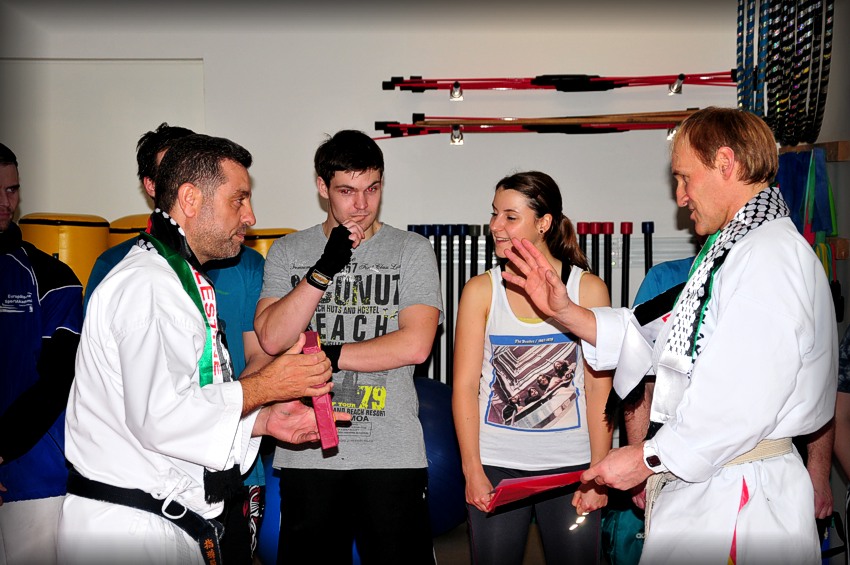 Foto oben: Karatemeister aus Jenin und Nablus waren eigens angereist um dem Training des Deutschen Jürgen Mayer 2013 in Ramallah beizuwohnen und auch um einen Trainingsbesuch zu bitten! وكان سيد الكاراتيه من جنين ونابلس وسافر إلى تدريب الألماني يورغن ماير في عام 2013 في رام الله لحضور وأيضا لطلب تجريب!