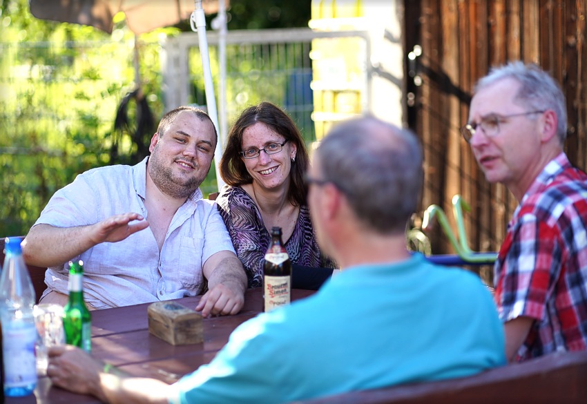 Erwachsenen saßen In fröhlicher Runde zusammen mit konstruktiven