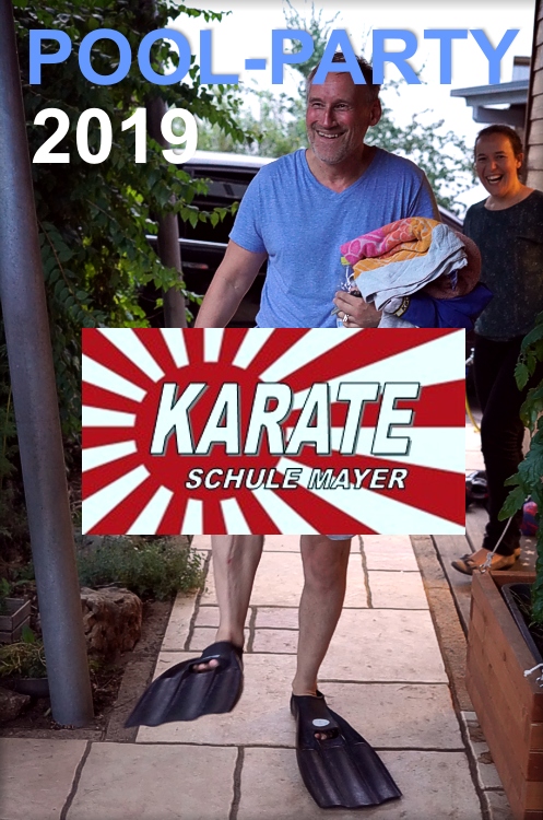 Freitag, den 2. August 2019 / Zur Zeit läuft ja das Sommertraining. Das heisst, Kinder und Erwachsene trainieren Dienstag und Freitag zusammen um 18:30 Uhr. 15 Teilnehmer für ein Ferientraining im August waren sehr gut! Erst wurde hart trainiert: KIHON, KATA, KUMITE, SELBSTVERTEIDIGUNG. Danach ging es zur Poolparty zu Sonja und man ließ es sich einfach gut gehen an diesem Abend bei traumhaft schönen Sommerwetter. Sensei Jürgen Mayer hatte das Training schweißtreibend gestaltet und danach schmeckte das Grillgut und das reichaltige Buffet, umso besser. Wer wollte, konnte sich in die hauseigenen Pool-Fluten stürzen.