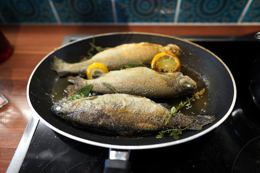 oben: Abendessen privat, frisch gefangene Forellen von Peter