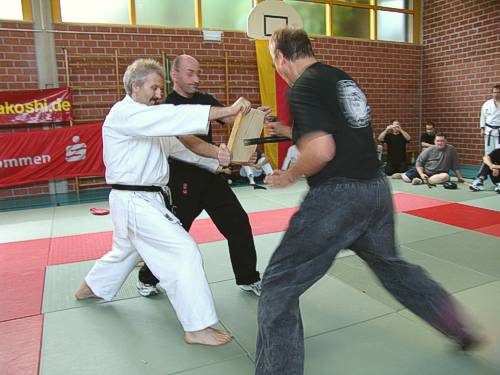 Unterbrochen wurden die praktischen Einheiten durch Theorieblöcke und Gespäche. Hier brachten die anwesenden Teilnehmer ihre jahrzehntelangen Kampfsportkenntnisse und ihr Wissen mit ein. Es wurde "miteinander" gesprochen und trainiert. Die bewährte Notebook-Präsentation der Arbeitsfolien kam wie immer gut an. |