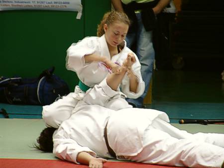 ![]() Nachmittag: Vor dem abschließenden Höhepunkt, den komplexen, vielseitigen Situationslösungen, diskutierte man im Theorieblock "Ranges" - die drei Kampfdistanzen und ihre dazu passenden Techniken mit dem Tonfa, sowie das Problem der Trefferflächen. Foto links: Mit Hilfe einer "Multimedia-Präsentation" (Texte, Charts, Fotos, Videos) im "HONBU-DOJO RUDOLFSHOF" unterschied man drei Kampfdistanzen . Links: Unsere "Mädels" fragten genau nach ... |
