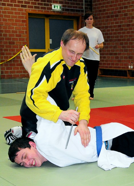 Ebenfalls komplexe, vielseitige und verblüffende Anwendungen zeigte Referent Jürgen Mayer mit dem traditionellen japanischen Kampffächer "Tessen" und dessen moderne, kaufbare Umsetzungen Kobutan und Tactical Pen. Block-, Stoß-, Reiß-, Hebel-,Transporttechniken mit diesem unscheinbaren, auf Anhieb nicht als SV-Waffe erkennbaren Gerät, begeisterte die Teilnehmer des Intensivkurses in der Rudolfshofer Grundschule!