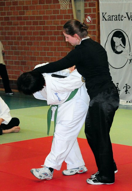 Dann kam das abschließende MODUL Situationslösungen, der Höhepunkt, die komplexen, vielseitigen Anwendungen . Es ging "knackig" zur Sache: Faust-, Fuß- und Griffattacken wurden mit Block, Schock, Stoß, Control, Take-Down, Festlege und Transporttechniken verhältnismäßig beantwortet. Verhältnismäßig heißt jedoch nicht unrealistisch. Professionell und praxisbezogen (so schnell wie möglich den Aggressor in die Bodenlage bringen) gingen auch die anwesenden Cracks vor.