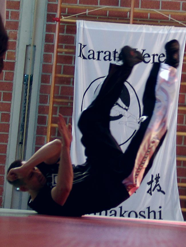 Es standen vier Trainingseinheiten, unterbrochen von mehreren kleinen Kaffee - und Kuchenpausen, bei excellenter Stimmung der Gruppe auf dem Programm: Bei den Handlingsübungen konnte Referent J. Mayer und sein Meister-Schüler Norbert Glaßl mit Schwungkombinationen, die unter anderen auch beidhändig ausgeführt werden, die "Tonfa-SV`ler" gut einstimmen. Handlingstechniken sind die Basis des Waffenkampfes. In einer richtigen SV-Situation muß man sich der Lage und Stellung seiner Waffe immer taktil bewußt sein. "FREESTYLE"-Handling zum Abschluß des ersten Moduls forderte die Kreativtät der Einsatzstock-Liebhaber. Foto rechts: Kata-Training in der Laufer Grundschule Die Fallschule ist Teil des Prüfungsprogrammes. Sie wurde nach den Grundtechniken als erstes nach der Mittagspause "mit und ohne den Waffenarm" geübt. Für die meisten Teilnehmer eine Paradedisziplin. Besonders erklärt wurde die "Seitliche Rolle die nicht so häufig trainiert wird.