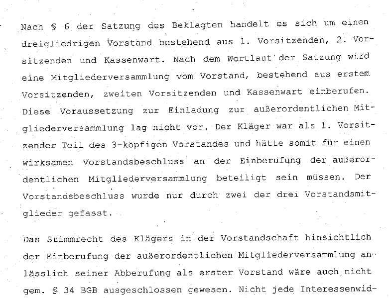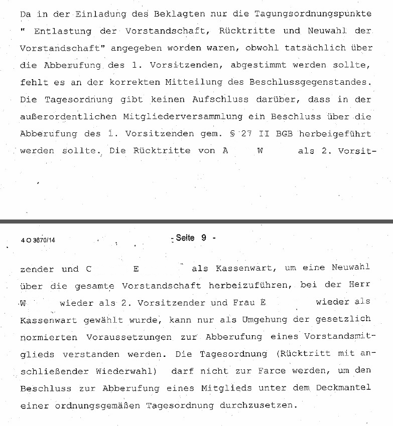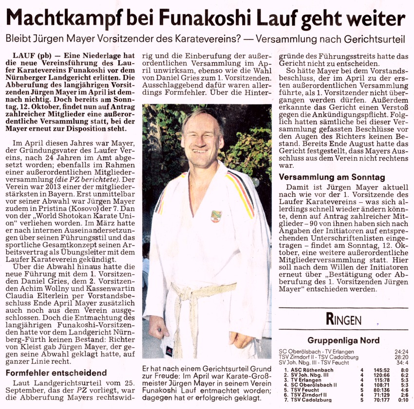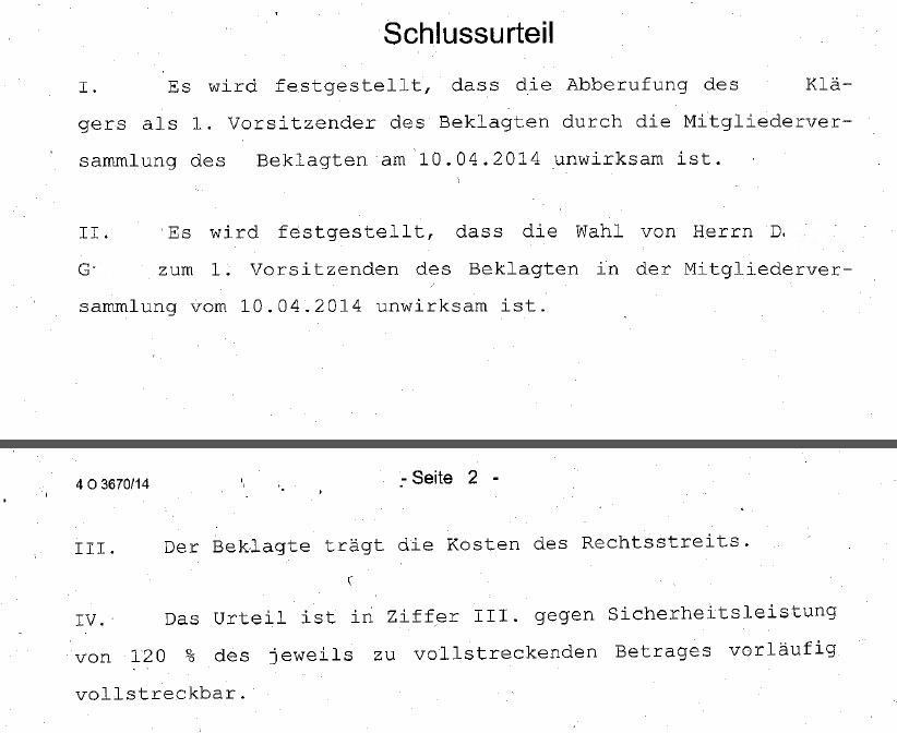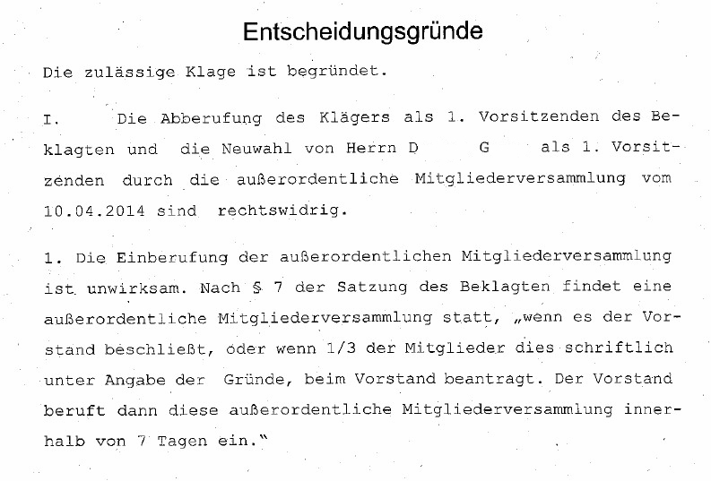 1.10.2014: das Landesgericht erlässt Urteil das Jürgen Mayer 1.Vors. des KVFL ist und war und entscheidet, dass die Wahl von D. G. unwirksam ist. In der Urteilsbegründung findet Richter Kleist deutliche Worte.