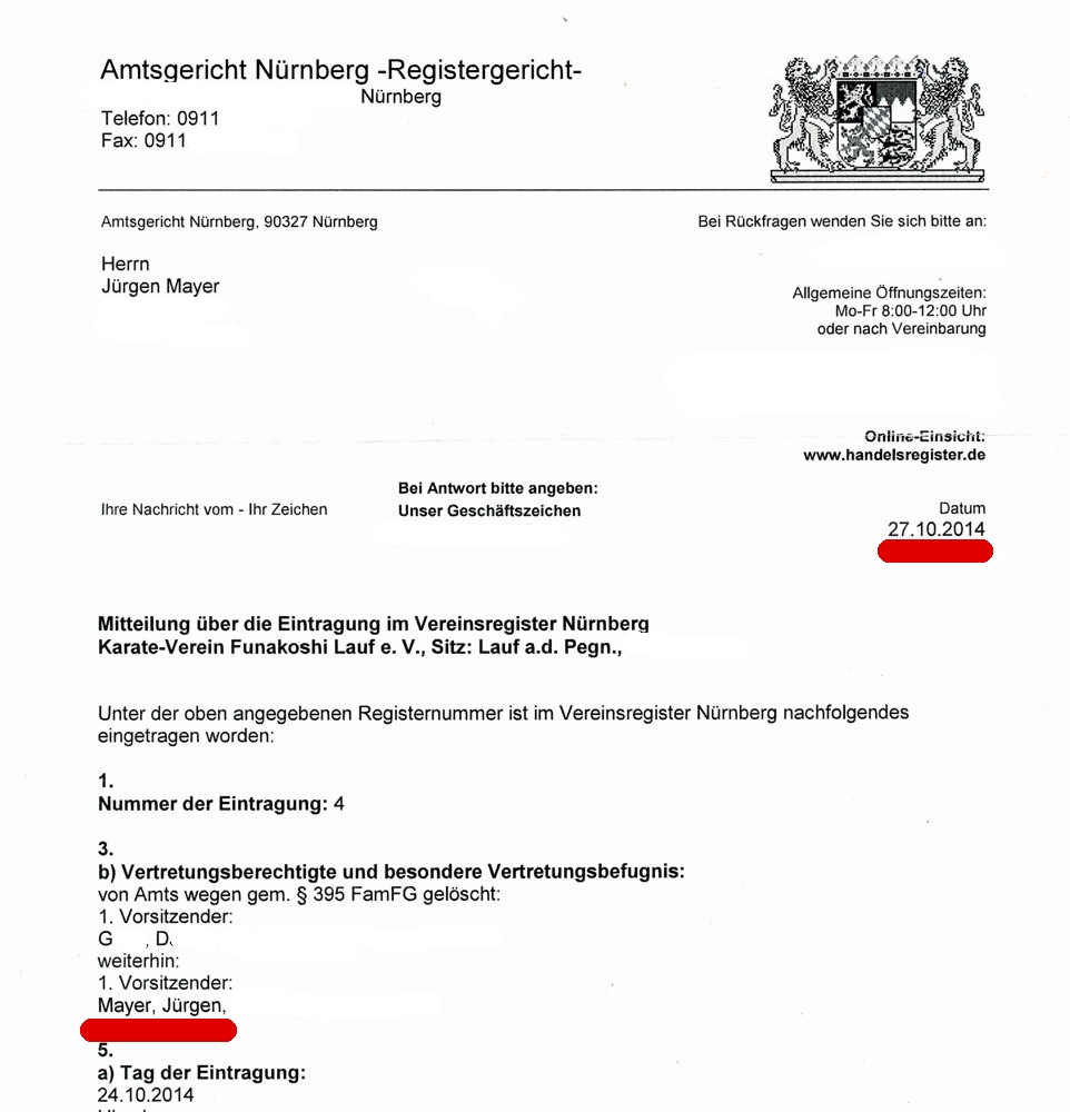 27.10.2014: Auch das Amtsregistergericht bestätigt Eintragung von Jürgen Mayer als 1.Vors. des KVFL und Löschung von D. G. nach außerordentlicher Sitzung vom 12.10.