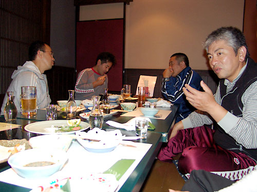 macht die typisch japanische Mahlzeit zum Genuss für alle Sinne. Trotz Bedenken mancher Deutscher in Bezug auf rohen Fisch und Tofugerichten, erweißt sich die jap anische Küche als geschmacklich hervoragend, vielseitig und äußerst gesund. Lieblingsspeise wurden Sushi, ein gesäuerter kalter Reishappen belegt mit unterschiedlichstem rohen Fisch und Meeresfrüchten: Garnelen, Krebsen, Muscheln und Tintenfisch. Das Ganze wird eingetunkt ins Standartgewürz "O-Shoju" (Sojasauce). Auch "Tempura", Fisch und Gemüsestückelchen in Teig gehüllt und fritiert schmeckten Klasse, besonders wenn sie für Jürgen von Kikuchi (Bild links) in Naha zubereitet wurden.