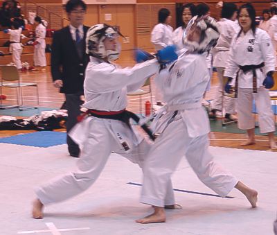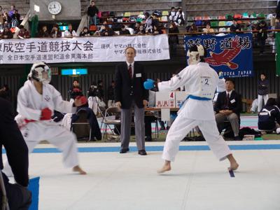 Fotos oben: bei den Highschool Meisterschaften (WKF-Regeln) ist nur ein Treffer ein Punkt. Verwarnungen gibt es fasst keine, auch bei sehr harten Treffern nicht! Übrigens ist es dem Einspruch der Europäer zu verdanken, dass der so erfolgreich in Japan verwendete Kopfschutz (keine blutigen Verletzungen/ richtiges Distanzverhalten) nicht international eingesetzt wird.