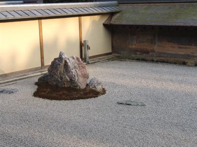 Fotos oben: Ryōan-ji (jap: 龍安寺, „Tempel des zur Ruhe gekommenen Drachen“) ist ein 1499 gegründeter Zen-Tempel im Nordwesten von Kyōto. Erbaut wurde er 1450 von Hosokawa Katsumoto. Er ist eine touristische Hauptattraktion und Teil der „Historischen Denkmäler des alten Kyoto“, seit 1994 ein UNESCO-Weltkuturerbe. Der Tempel gehört zur größten Schule des Rinzai-Zen mit dem Muttertempel Myōshin-ji. Hauptattraktion des Tempels ist der hier befindliche und wohl berühmteste Zen-Garten Japans, der Hojo-Teien im Kare-san-sui-Stil aus der Mitte des 15. Jahrhunderts. Der Garten besteht aus einer Fläche (30 mal 10 Meter) aus fein gerechtem Kies mit 15 scheinbar zufällig platzierten Steinen in 5 bemoosten Gruppen. Aus keinem Blickwinkel sind alle 15 Steine sichtbar. Die südliche und westliche Seite des Gartens ist von einer rötlichen Mauer gesäumt, über welcher der Blick auf die Bäume und Sträucher des begehbaren Gartens fällt. Auf der nördlichen Seite befindet sich das Tempelgebäude mit der Sitzterrasse, von der aus man den Steingarten überschaut.