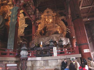 Foto oben: Der Tōdai-ji (jap. 東大寺, wörtlich: östlicher großer Tempel) ist ein buddhistischer Tempel in der japanischen Stadt Nara. Er beherbergt die größte buddhistische Bronzestatue und ist das größte rein aus Holz gebaute Gebäude der Welt. Die Statue des Großen Buddha (jap. 大仏 daibutsu) stellt Buddha Vairocana (jap. Birushana, bzw. Dainichi) dar. Sie befindet sich in der größten Halle des Tōdai-ji (大仏殿 Daibutsuden), welche 1708 neu aufgebaut wurde, ursprünglich aber noch um ein Drittel größer gewesen sein soll. Die aus Bronze gegossene Figur ist alleine 16,2 m hoch, 452 t schwer, und mit Sockel 30 m hoch. In der Tempelanlage befindet sich auch ein Schrein der Shintō-Gottheit Hachiman, der in der Nara-Zeit (710–794) zum Schutzgott des Großen Buddha erklärt wurde. Bemerkenswert ist auch das Eingangstor (Nandaimon) aus dem Jahr 1199, mit den beiden rund 8,5 m hohen Wächterstatuen (Niô). Die Anlage des Tōdai-ji zählt zum UNESCO-Weltkulturerbe.