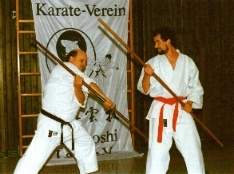 Bundestrainer Rainer Seibert links, mit Dan-Träger Klaus Oblinger beim Bo-Kumite vor Jahren |