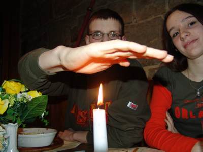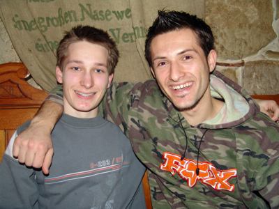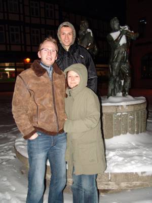 Im Restaurant Kartoffelhaus am Samstagabend Leistungssportreferent Jörg König und seine Liebste Ines verbrachten uns am Samstagabend ins Spezialitäten-Restaurant "Kartoffelhaus". Unter den Augen des "Alten Fritz" gab`s Feines von der Knolle. Gut gestärkt machte Johannes gleich die Mutprobe "Wer hält am Längsten die Hand über die Kerzenflamme ...! Jessica aus Wittenberg ist skeptisch ... und die Sonnyboys Ingo und Almer (Foto unten) hatten ihren Spaß dabei. KALT WAR`S in Q. // siehe das Foto am altehrwürdigen Marktplatz und auf dem Weg zum KH. Noch 10 min länger und die "Reisegruppe" im Vordergrund wäre genauso steif gewesen wie die Steinkameraden im Hintergrund ;-) Jürgen Mayer 3-2006 |