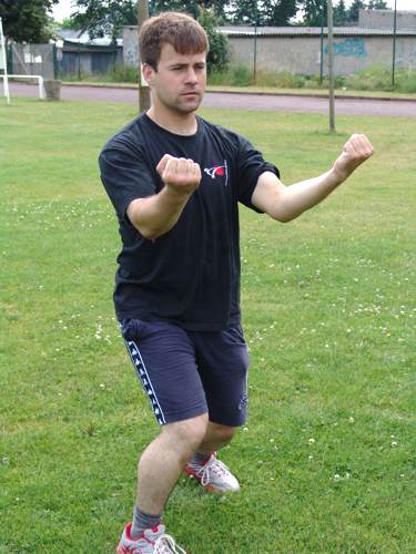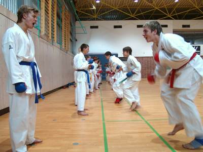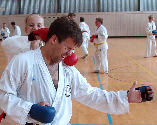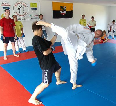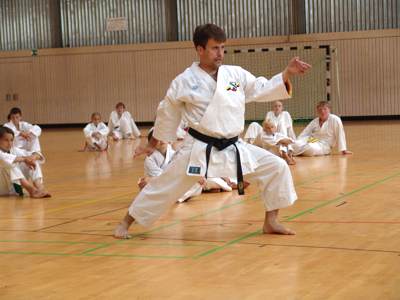 Der KUMITE-Landestrainer des KVSA Jürgen Mayer , 4.Dan war ebenso hochmotiviert wie seine anwesenden Kämpfer. Der A-Trainer unterrichtete in der Praxis WORLD-KARATE-FEDERATION Kumitetechniken, die mit der Taktik verknüpft wurde. So wurde die Reaktionsschnelligkeit und das korrekte Timing im Angriff mit Basis-Techniken und -kombinationen trainiert. Damit baute er auf das Training von Kumite-Schülertrainer Jörg König, 2.Dan am Tag davor auf. Beide ziehen am gleichen Strang - nicht nur an diesem Wochenende in der Altmark.