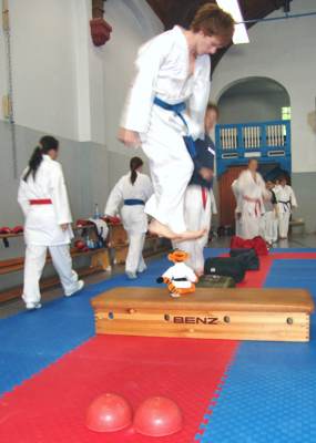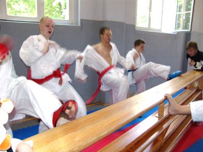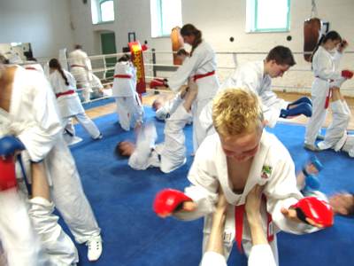 Halle 17.-18.06.2006/ Halle war wieder einmal Gastgeber für die besten Kämpfer aus Sachsen-Anhalt. Zusammen wurde die letzte Vorbereitung zur Deutschen Karatemeisterschaft der Schüler und Jugendlichen, die am 24.-25.Juni in Erfurt in Thüringen stattfinden wird, abgewickelt. Die Kämpfer des Landeskaders Sachsen-Anhalt absolvierten hochintensive Trainingseinheiten in Halle. Die Inhalte und Belastungsnormative (unmittelbare Wettkampfvorbereitung) wurden im Hinblick auf die DM JUG in Erfurt ausgewählt. Die Einheiten waren wettkampfspezifischer ausgerichtet (viel Sparringsübungen und die Intensität stand im Vordergrund (kurze Belastungszeiten entsprechend dem WKF-Regelwerk). In vier praktischen Trainingseinheiten am Samstag und am Sonntag wurden Schnellkraft, Kurzzeitausdauer, Technik und Taktik (Punktevorsprung -bzw. Rückstand, u.a.), trainiert. Leider fehlten u.a. die entschuldigten Leistungsträger Lisa (Wernigerode) Apti (Magdeburg) und Almer (Lauf) die krank oder verhindert waren. Am Sonntag konnten die Stars Alice und Stephan doch noch am Training teilnehmen und motivierend ihre Vorbildfunktion für die "DM-heißen" Jugendlichen erbringen. Toll, dass auch wieder Schüler diese zusätzliche Chance des Leistungstrainings nutzen. Klasse sind hier Florian, Julia und Nadja! |