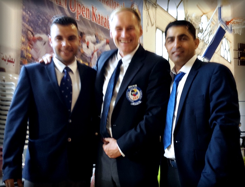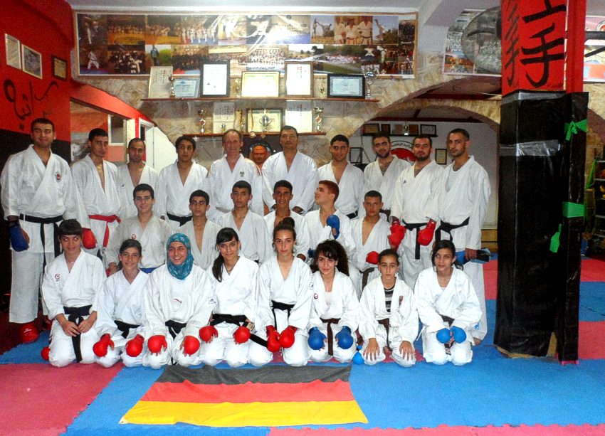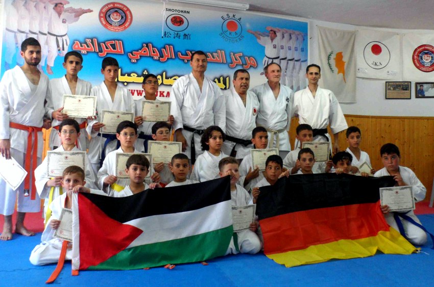 Ramallah, Palästina, Samstag den 18.05.2013/ Vom Norden aus Israel her, erreichte Jürgen Mayer, 6.DAN zusammen mit seinem Gastgeber Ali Tarabeih, 6.DAN, das Westjordanland, jetzt autonomes Palästina! Es wurden u.a. die bekannten Städte Jenin und Nablus durchquert und man erreichte die Hauptstadt Palästinas Ramallah. Hier befindet sich auch der Sitz des Präsidenten Abbas. Mittlerweile soll es 85.000 Einwohner haben. Im Herzen Ramallahs, im Sports & Karate Training Centre im Umaia Building im 5.Stock, unterrichtete der Laufer Karatekämpfer auf Einladung von Sensei Issam Shaban, 6.DAN WKO, 4.DAN JKA, Shotokan Kata (Heian 1- 4, sowie in der Oberstufe die Formen Bassai-Dai, Jion & Empi) und modernes WKF Kumite in zwei Einheiten. Mr. Shaban ist 56 Jahre alt und trainiert seit 36 Jahren Shotokan Karate. Nach dem ansternegenden Training kam es zu Urkundenverleihungen und Ehrenbezeugungen. Bereits in seiner Begrüßungsrede erklärte Sensei Shaban, dass die Deutschen immer den Palästinensern geholfen haben. das Training wurde reflektiert in Zeitungsartikeln, mehreren Karate- und allgemeinen News-Webseiten. Letztlich kam es auch noch zu einem Radiointerview mit der "Stimme Palästinas" mit dem Deutschen das 10 Minuten dauerte. Abschließend besuchte man das neue In-Lokal "KFC" in Ramallah, die eine Freiterrasse im 1.Stock hat, die es ermöglicht auch einen grossartigen Blick über die wunderschöne hügelige Stadt zu haben!